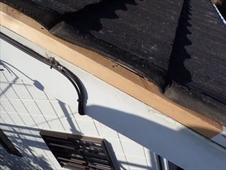 瓦の状態です。屋根の袖に取り付けられているケラバ瓦の固定が弱まり、外れ落ちかけています。ケラバ瓦は、釘で固定されているため風などの煽りを受けることで、釘の固定が弱まり浮いてしまいます。浮いた釘から雨水が内部に伝い、下地が傷むことで現状のように外れてしまう状態になります。